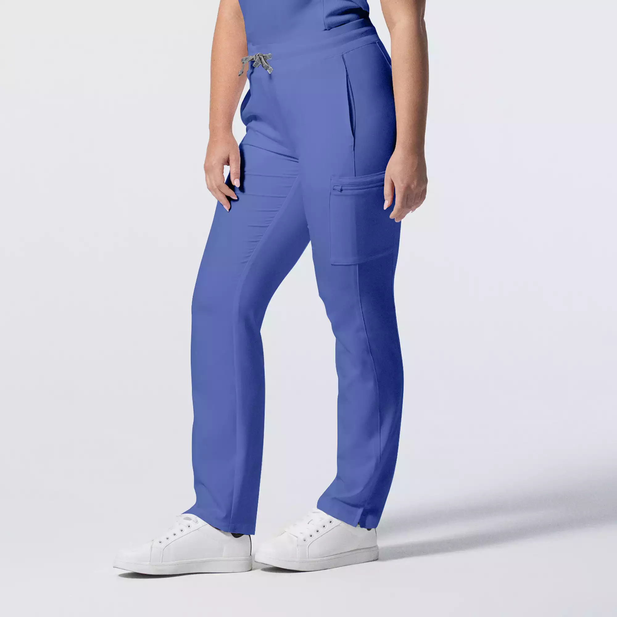 These women’s mid-rise straight-leg scrub pants feature a soft rib-knit waistband with a convertible drawstring that can be tied inside or outside the waist, giving you the ability to adjust your look as you see fit. Our modern tailored fit flatters your shape, while our moisture-wicking super stretch fabric provides the comfort and flexibility your work requires throughout the day. Seven pockets, including hidden hip pockets and a secure zip cargo pocket keep your essentials within easy reach.