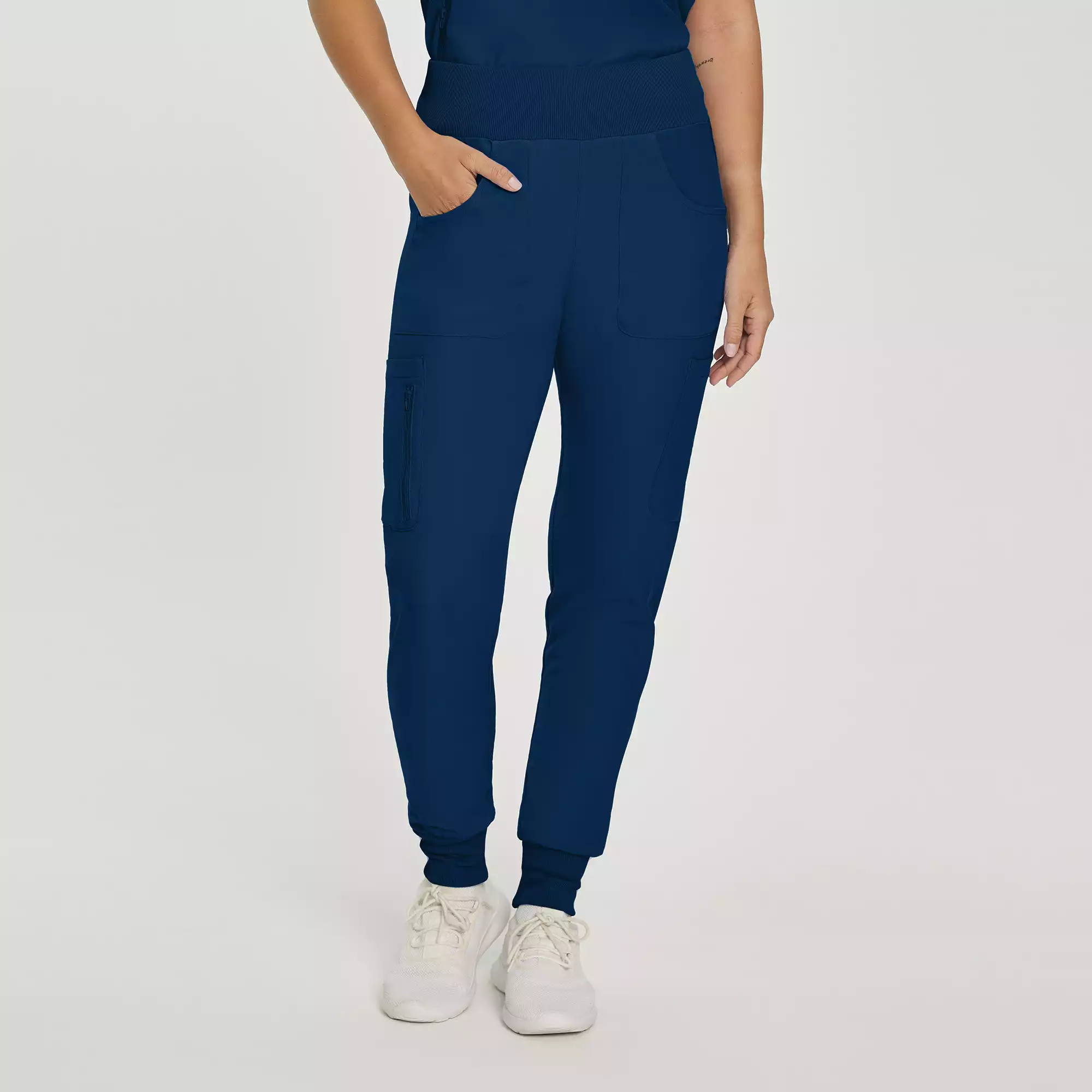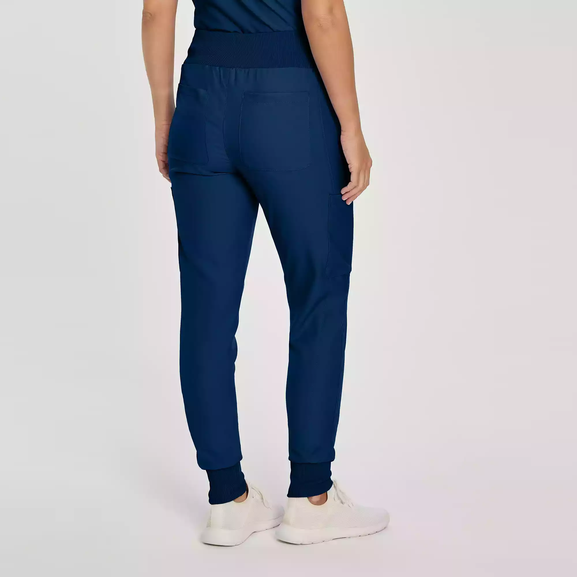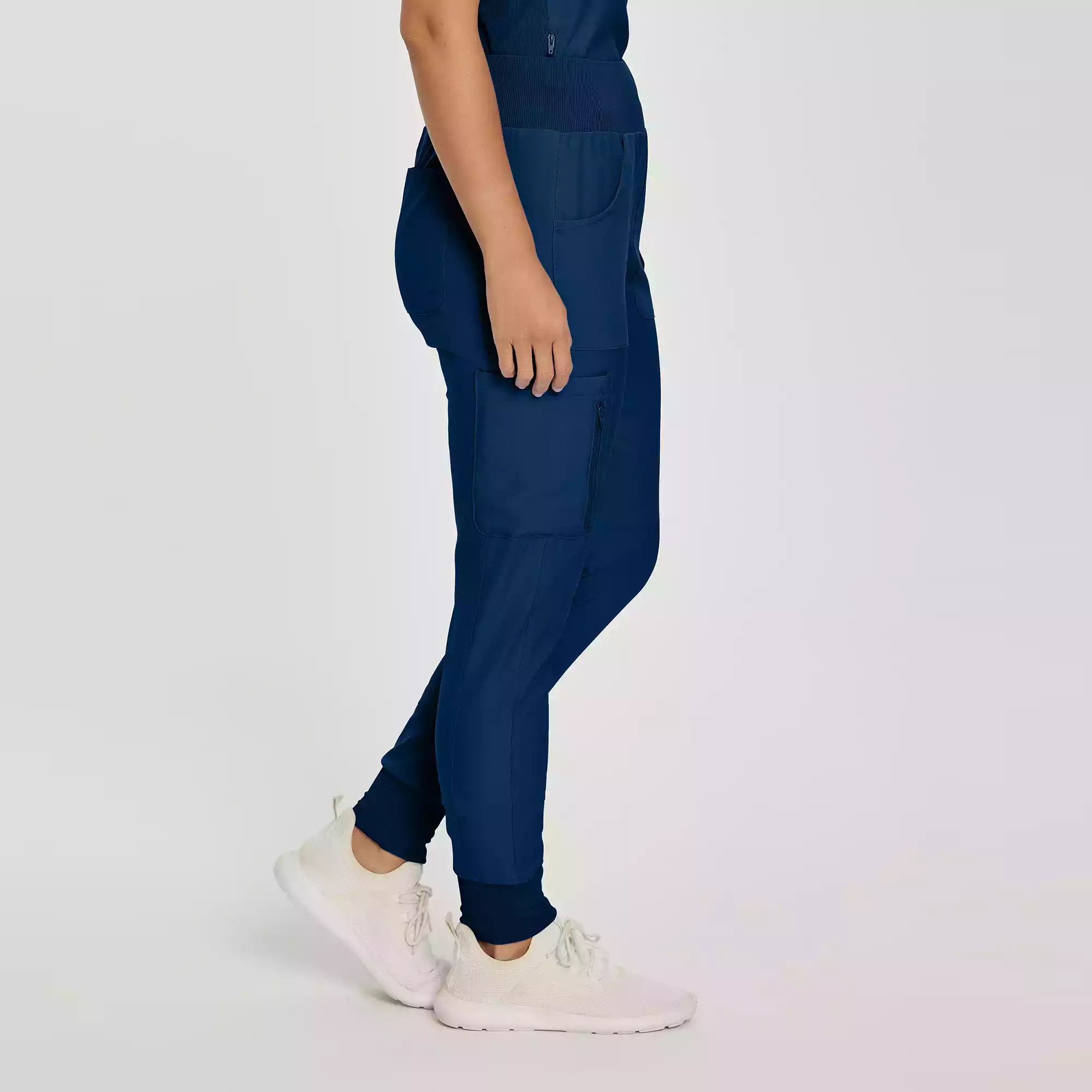 These women’s mid-rise jogger scrub pants feature a stretchy rib-knit waistband with an internal drawstring for a clean look with an adjustable fit. Soft, comfortable rib-knit leg cuffs and hidden rib-knit panels down the inseam of the pant legs allows for ample freedom of movement. Our modern tailored fit flatters your shape, while our moisture-wicking super stretch fabric provides the comfort and flexibility your work requires throughout the day. Seven pockets, including a secure zip cargo pocket keep your essentials within easy reach.