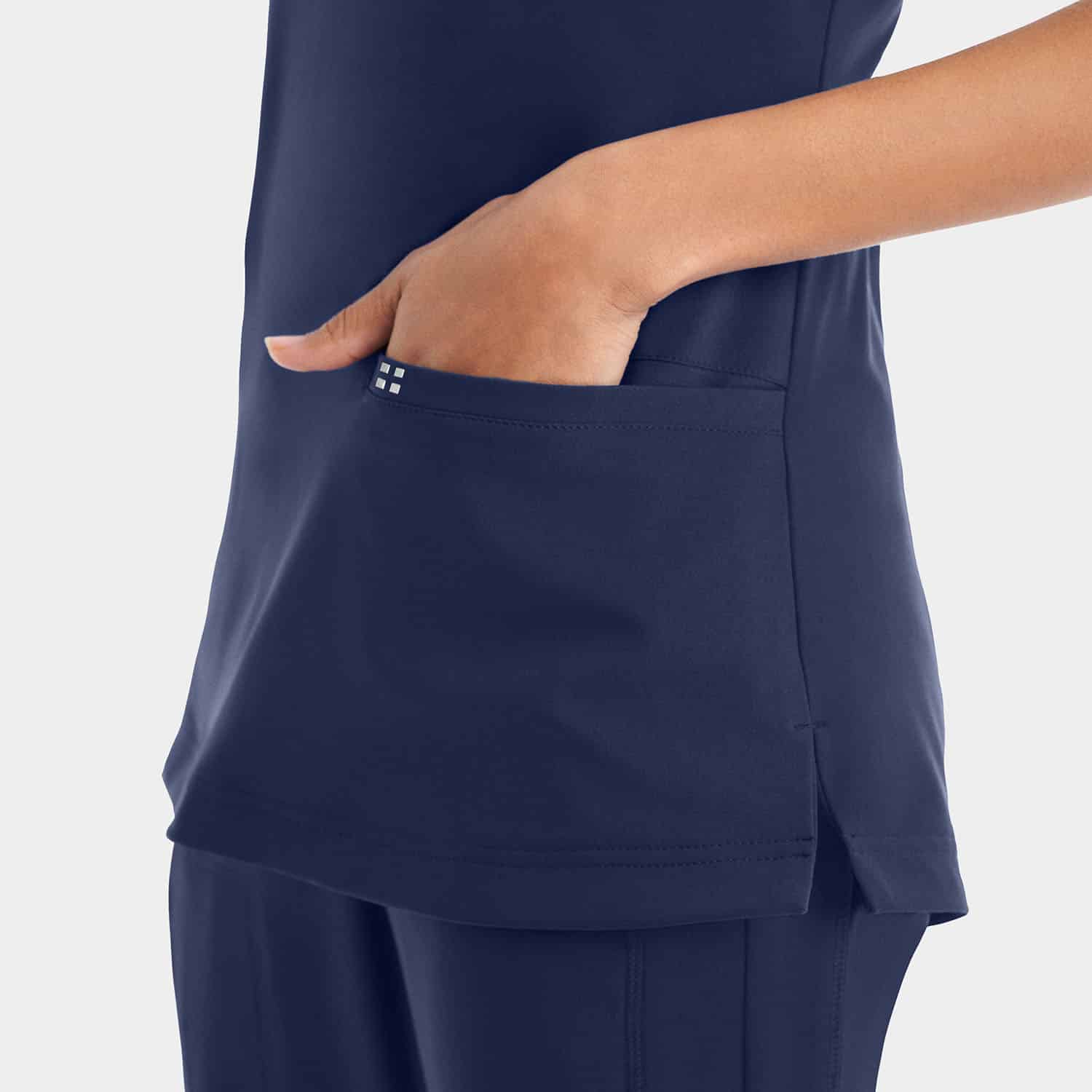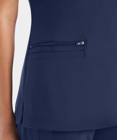 A Modern Fit v-neck top with a piecing detail neckline gives this top an elevated look. Features a single zipper pocket to keep your personal items secure and 2 welt pockets for easy access to grab anything you may need. Back side knit panels provide extra comfort and movement.